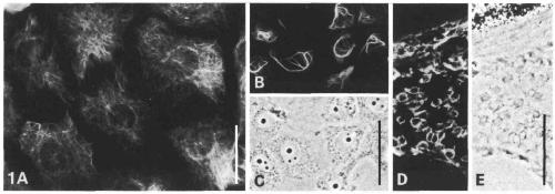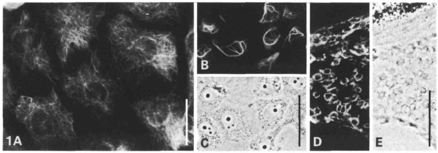 Fig. 1. Immunofluorescence microscopy showing reactions of monoclonal antibody VIM-3B4 to vimentin on cultured kidney epithelial (XLKE) cells of line A6 (A-C) and a frozen section of ovary tissue of Xenopus laevis (D,E). (A) Typical fibrillar networks of vimentin IFs are seen in XLKE-A6 cells. (B,C) Epifluorescence (B) and phase-contrast (C) pictures of the same field of an XLKE-A6 cell monolayer after treatment with 10 M-colcemid for 4h, showing aggregates of collapsed IF in the perinuclear cytoplasm, as is typical for vimentin IF. (D,E) Epifluorescence (D) and phase contrast (E) pictures of a cryostat section of ovarian tissue, showing bright staining of interstitial cells as well as endothelial cells and erythrocytes of a blood vessel. Bars, 50,um. |