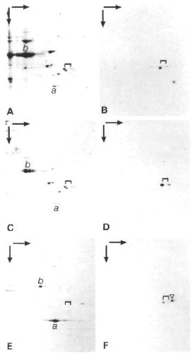 Fig. 3. Identification of the polypeptides encoded by the cDNA clones pXenViml and pXenVim4. Coelectrophoresis of the high-salt-buffer-resistant cytoskeletal proteins of XLKE-A6 cells (same system and symbols as in Fig. 2C,D) with products of in vitro translation from hybrid-selected embryonal stage-18 mRNA (A,B) and from mRNA obtained by in vitro transcription/translation of pXenViml (C,D). Coelectrophoresis of the mixed products obtained from in vitro transcription/translation of pXenViml and pXenVim4, respectively (E,F). (A,B) Coomassie-brilliantblue- stained gel (A) and corresponding autoradiograph (B), showing that the [ SJmethionine-labelled in vitro translation products from hybrid-selected mRNA comigrate with unlabelled vimentin (bracket) of XLKE-A6 cells. (C,D) Coomassie-brilliant-blue-stained gel (C) and corresponding autoradiograph (D) of the product obtained by in vitro transcription and translation, showing that the [ SJmethionine-labelled translation product comigrates with unlabelled vimentin (bracket) of XLKE-A6 cells. Note that some modification, probably phosphorylation, also takes place in the rabbit reticulocyte assay used for in vitro translation, resulting in the appearance of a minor, more acidic variant. (E,F) Coomassie-brilliant-blue-stained gel (E) and corresponding autoradiograph (F) of mixed in vitro transcription/translation products of Xenopus vimentin clones pXenViml and pXenVim4. As revealed from parallel gels of individual [35S]methionine-labelled translation products, pXenVim4 is translated into a polypeptide slightly more acidic and less mobile (triangle) than pXenViml (bracket). Fluorography was for 4h. After prolonged exposure acidic variants were also visible. |