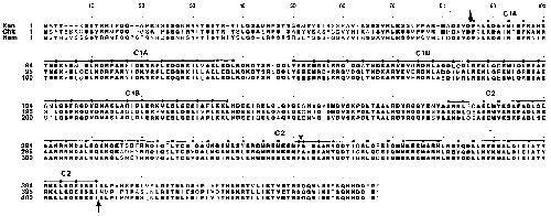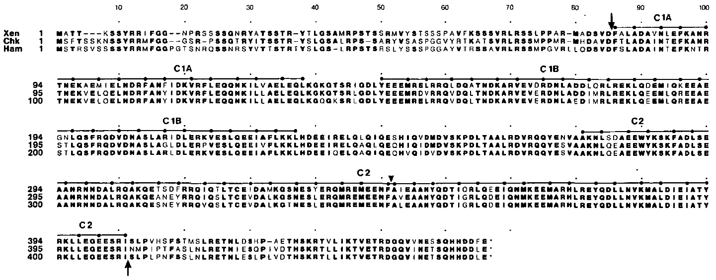 Fig. 5. Amino acid sequence comparison of Xenopus vimentin Vim 1 (Xen), chicken vimentin (Chk; taken from Zehner et al. 1987) and hamster vimentin (Ham; taken from Quax et al. 1983). Bold-faced letters denote amino acids identical in Xenopus and at least one of the other two species. Amino acid sequences have been aligned for maximal homology, insertions introduced for this purpose are denoted by horizontal bars. The downward arrow demarcates the start and the upward arrow the end of the a'-helical rod domain. The dots represent positions a and d of the heptade convention to maximize coiled-coil configuration. The rod domain contains two non-o--helical interruptions of 11 and 43 amino acids, respectively, giving rise to coiled-coil subdomains 1A (CIA), IB (C1B) and 2 (C2). The arrowhead indicates an alteration in the heptade pattern that probably results in a 'stutter' in coil 2. |