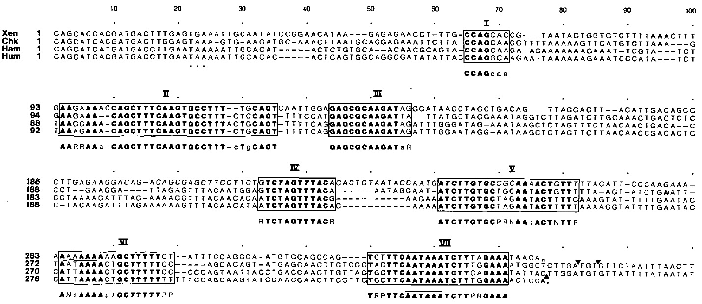 Fig. 6. Comparison of the 3'-untranslated sequences of vimentin mRNAs of Xenopus (Xen), chicken (Chk; from Zehner et al. 1987), hamster (Ham; from Quax et al. 1983) and human (Hum; this study) as determined from cDNAs and genes, respectively. Sequences have been aligned for maximal homology and insertions introduced for this purpose are denoted by horizontal bars. The three stars mark the ends of the coding region. Regions of relatively high homology are boxed and numbered by roman numerals. Bold-faced letters denote nucleotides present in all four sequences. The apparent consensus sequences are indicated underneath each box; Lower case letters indicate the presence of at least three identical nucleotides. P, pyrimidine nucleotide; R, purine nucleotide. The arrowheads indicate the probable polyadenylation sites in the genomic sequences for chicken (Zehner & Paterson, 1983) and hamster vimentin (Quax et al. 1983). Note that the presumptive polyadenylation signal (overlined) in box VII is flanked by a highly conserved sequence. |