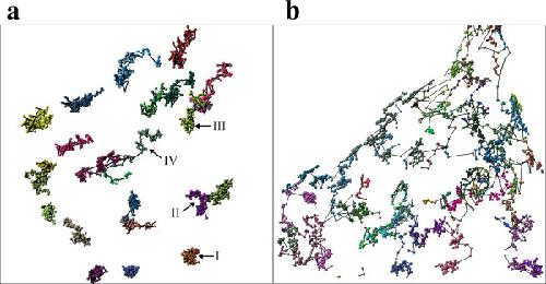 Figure 3. 4-D visualization of vimentin particle trajectories a) in the nucleus and b) the cytoplasm. Each color represents an individual vimentin body. The respective centers of masses are indicated as spheres. Tracks are symbolized by interconnecting lines. Arrows indicate the different kinds of diffusion (see Figure 4a). Major types of movement are indicated: I) confined diffusion; II) obstructed diffusion; III) normal diffusion; IV) directed motion.