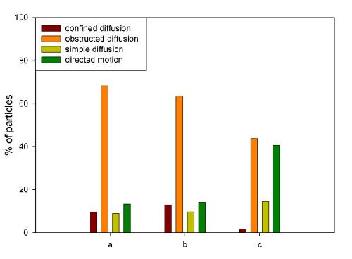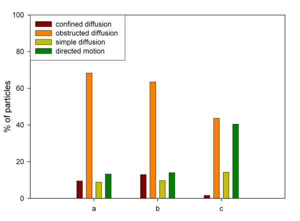 Figure 5. Classification of particles into four groups of diffusional motion according to cellular localization and their calculated anomalous diffusion coefficient. a) nuclear vimentin particles, (b) microinjected nuclear 100 nm microspheres, (c) cytoplasmic vimentin particles.