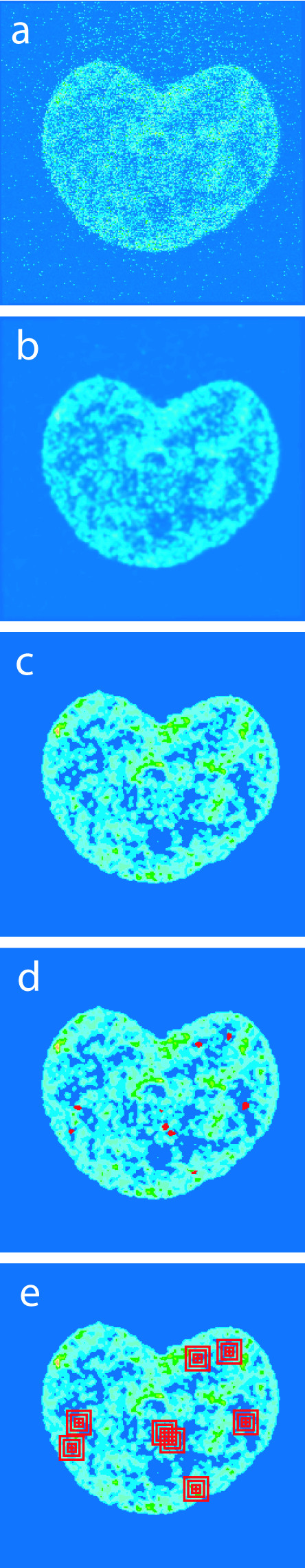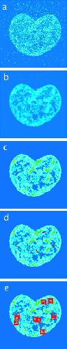 Figure 7. Chromatin intensity analysis showing the preprocessing steps for the Hoechst 33342 images: a) unprocessed original image; b) Gaussian smoothing; c) image classified into 8 regions of grey values; d) localization of particles in the cell nucleus (red); e) measuring the mean grey value intensity around the center of mass for each individual vimentin particle (see Methods for a complete description).