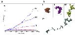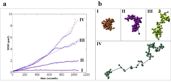 Figure 4. Different classes of mean square displacement of tracked nuclear vimentin particles. a) Mean squared displacement (MSD) of four representative modes of particle mobility (x-axis: acquisition time in seconds; y-axis: MSD). Roman numbers: I) confined diffusion; II) obstructed diffusion; III) normal diffusion; IV) directed motion (The numeration refers to indicated trajectories in Figure 3a). b) The four different mobility classes are represented by particle trajectories. The trajectories correlate to the numbers indicated by arrows in Figure 3a.