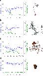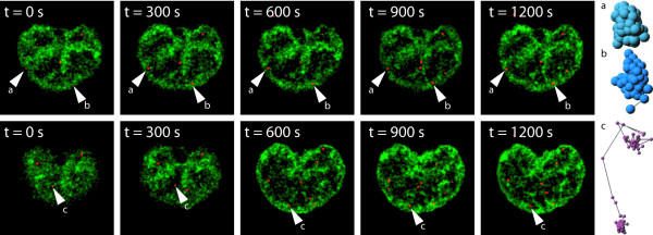 Figure 6. 4-D – tracking of vimentin particles in the nucleus. (a, b) particles with restricted movement (confined diffusion) c) corralled particle and corresponding trajectories. (red = vimentin bodies; green = Hoechst 33342 staining).