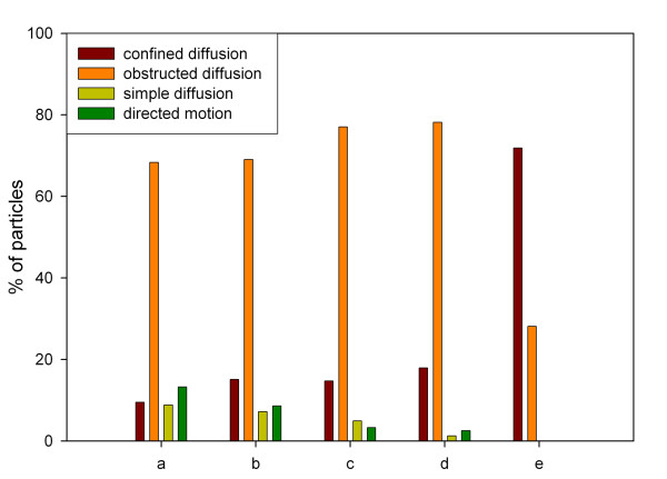 Figure 9. Mobility of nuclear vimentin bodies under the influence of inhibitors. Classification was performed according to the diffusion coefficient. a) control; b) azide / deoxyglucose (10 mM / 50 mM); c) cytochalasin D (1 μg/ml); d) nocodazole (0.04 μg/ml); c) sorbitol (600 mM).