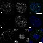 Figure 1. A) Nucleus of a SW13 cell stably transfected with an expression plasmid encoding for GFP-NLS-vimentin. B) SW13 cell nucleus containing microinjected 100 nm-microspheres. C) SW13 cell transfected with GFP-vimentin showing cytoplasmic particle formation. A', B', C'): Corresponding Hoechst 33342 chromatin stain, A, B, C) superimposed images.