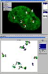Figure 2. Screen shot of the image processing platform TIKAL. (top) Image shows a sample two-dimensional section through a nucleus with binarized nuclear particles (red) counterstained with Hoechst 33342 stain (green). Pull down menu exemplifies different tools for quantitative analysis integrated into TIKAL. Numbers indicate different nuclear particles reconstructed by 3D isosurface reconstruction (bottom). Computed tracks of nuclear bodies over time are displayed as spheres on a string in the multi-dimensional scene viewer.