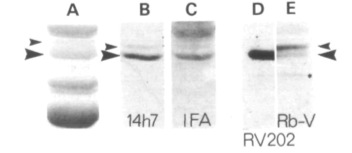 (left side) or RV202 (right side); the labelled 55xlO polypeptides align perfectly. To define the specificity of 14h7 and RV202 in embryos, insoluble residues from stage- 35 tadpoles were separated by SDS-polyacrylamide gel electrophoresis and either stained with Coomassie brilliant blue (E) or transferred to nitrocellulose and probed with