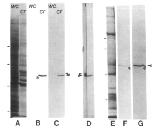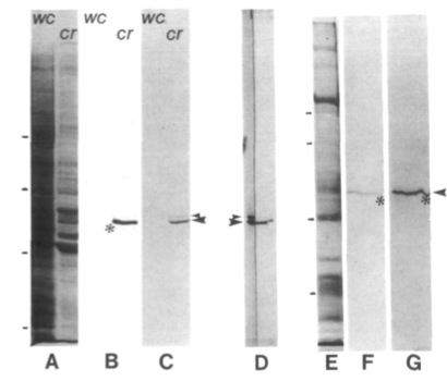 57xlO . A minor band that presumably represents a proteolytic degradation product of the 55 x 103 polypeptide was also labelled by both antibodies (asterisk in F and G).