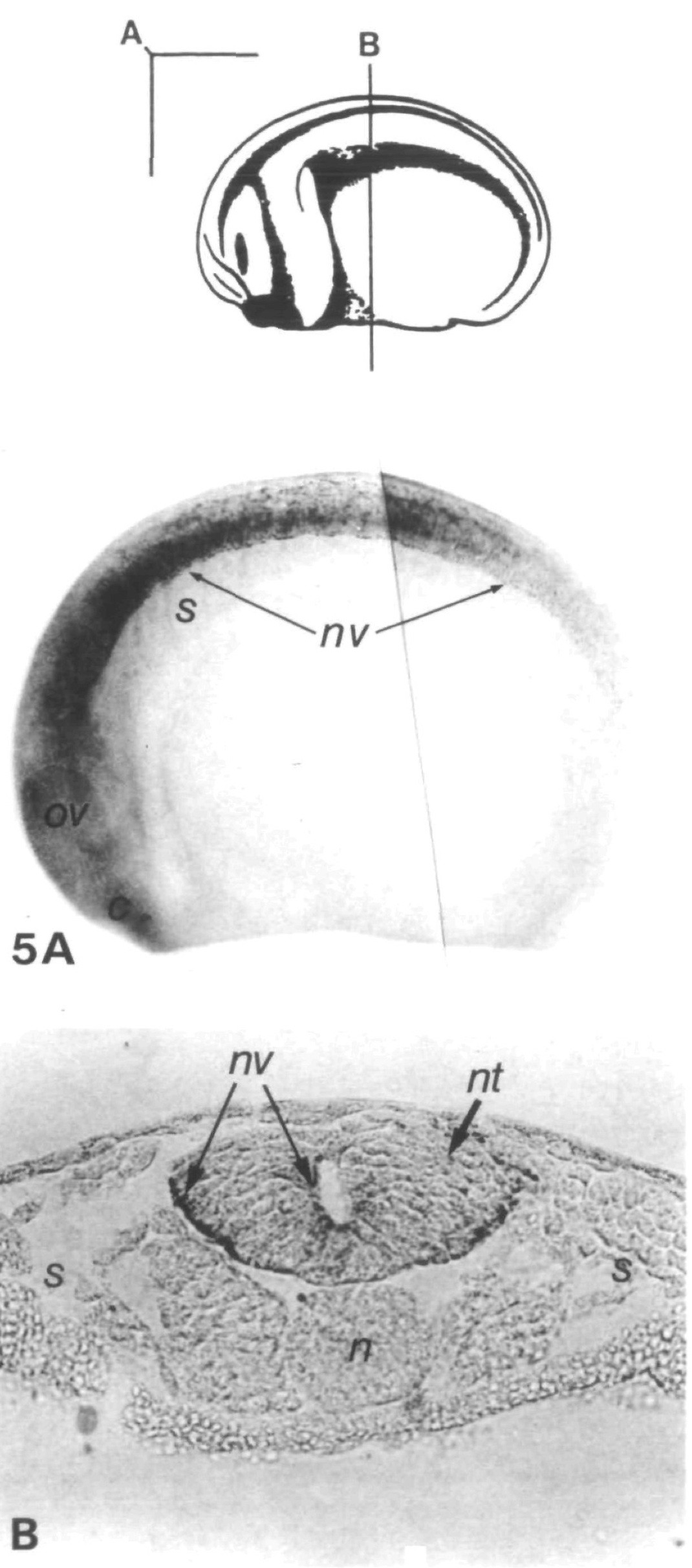 Fig. 5. Vimentin expression in stage 20 and 22 embryos. In a lateral optic section of a stage-22 embryo stained with RV202 (A), vimentin-expressing cells of the anterior neural tube (nv) are more elongate. Somites (s) are beginning to form beneath the anterior neural tube; vimentin staining can be seen on their surfaces in different focal planes. In a transverse physical section through the trunk of a stage-20 embryo stained with 14h7 (B), the cells at the outer margin of the neural tube stain intensely and those on the ventricular surface stain weakly (nv). The stained cells on the outer margin of the neural tube are restricted to the lateral neural tube and are absent from both dorsal and ventral regions, c, cement gland; n, notochord; nt, neural tube, ov, optic vesicle. Bars in A, 150/im; in B, 100 fim.