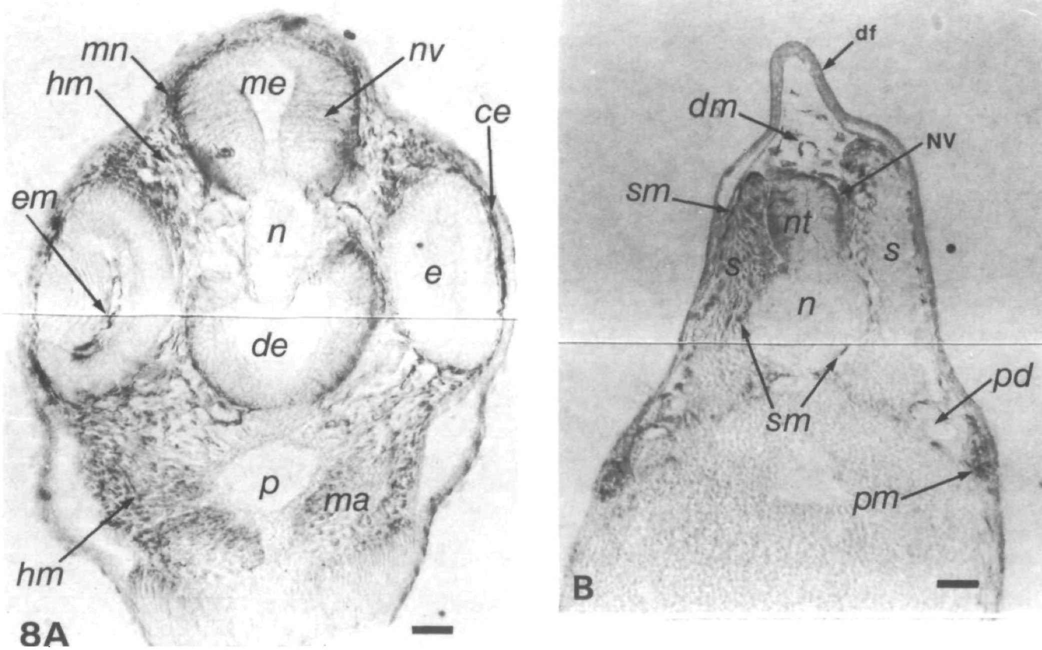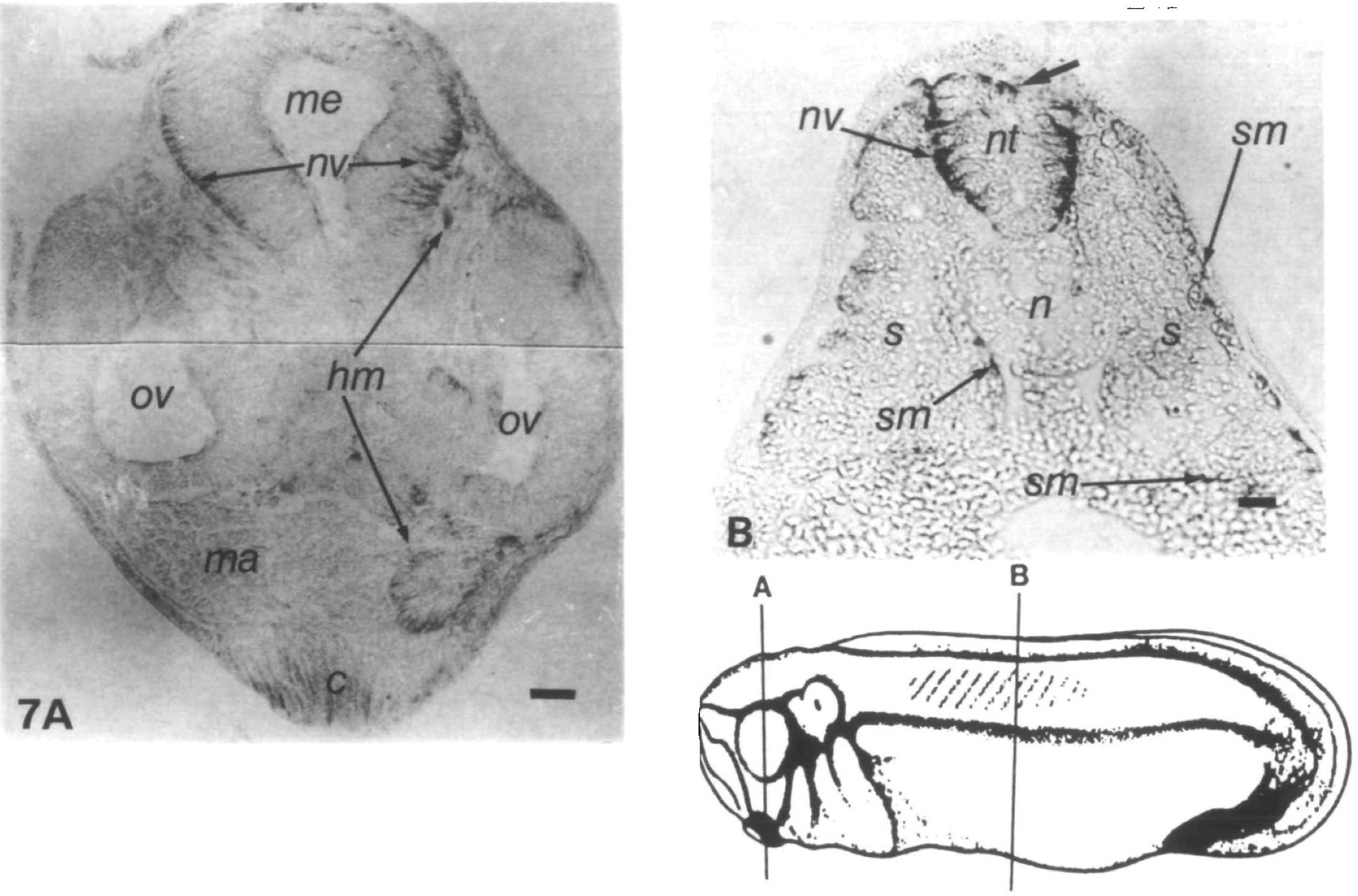 Fig. 7. Vimentin expression in the head region of the stage-26 embryo. In a transverse physical section through the head of a stage-26 embryo stained with 14h7 (A), vimentin-expressing headmesenchyme (hm) appears adjacent to the brain and in the region of the mandibular arch (ma). Vimentin-containing processes of cells of the mesencephalon (me) extend in toward the ventricle (nv). Staining in the cement gland is an artifact. In a transverse physical section through an anteriorsomite of the trunk stained with 14h7 (B), the mesenchyme at the surface of the somites (sm) is expressing vimentin. Vimentin- expressing cells (nv) are present at the margin of the neural tube and have small processes that extend midway to the ventricular surface. There are no vimentin-expressing cells in the ventral region of the neural tube. There appear to be vimentin-expressing mesenchymal cells dorsal to the neural tube (unmarked arrow), c, cement gland; ma, mandibular arch; me, mesencephalon; n, notochord; nt, neural tube; ov, optic vesicle; s, somites. Bars, 50 jxm in both parts.