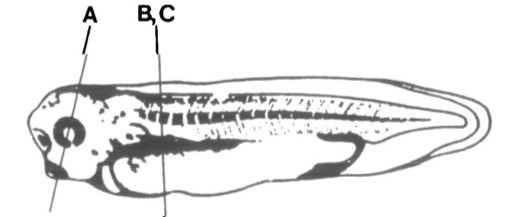 Fig. 8.C Transverse sections of stage-35 embryos stained for vimentin. In the area of the embryoventral to the region illustrated in B (C) are found the lateral body wall and the yolky endodermventral to the pronephros. The pronephric mesoderm is at the top (pm) and below it, between the mesoderm and the endoderm are the vitelline veins (vv) which contain vimentin-expressing mesenchyme. vv, vitelline veins. pm, pronephric ducts. Bar 25 um in C.