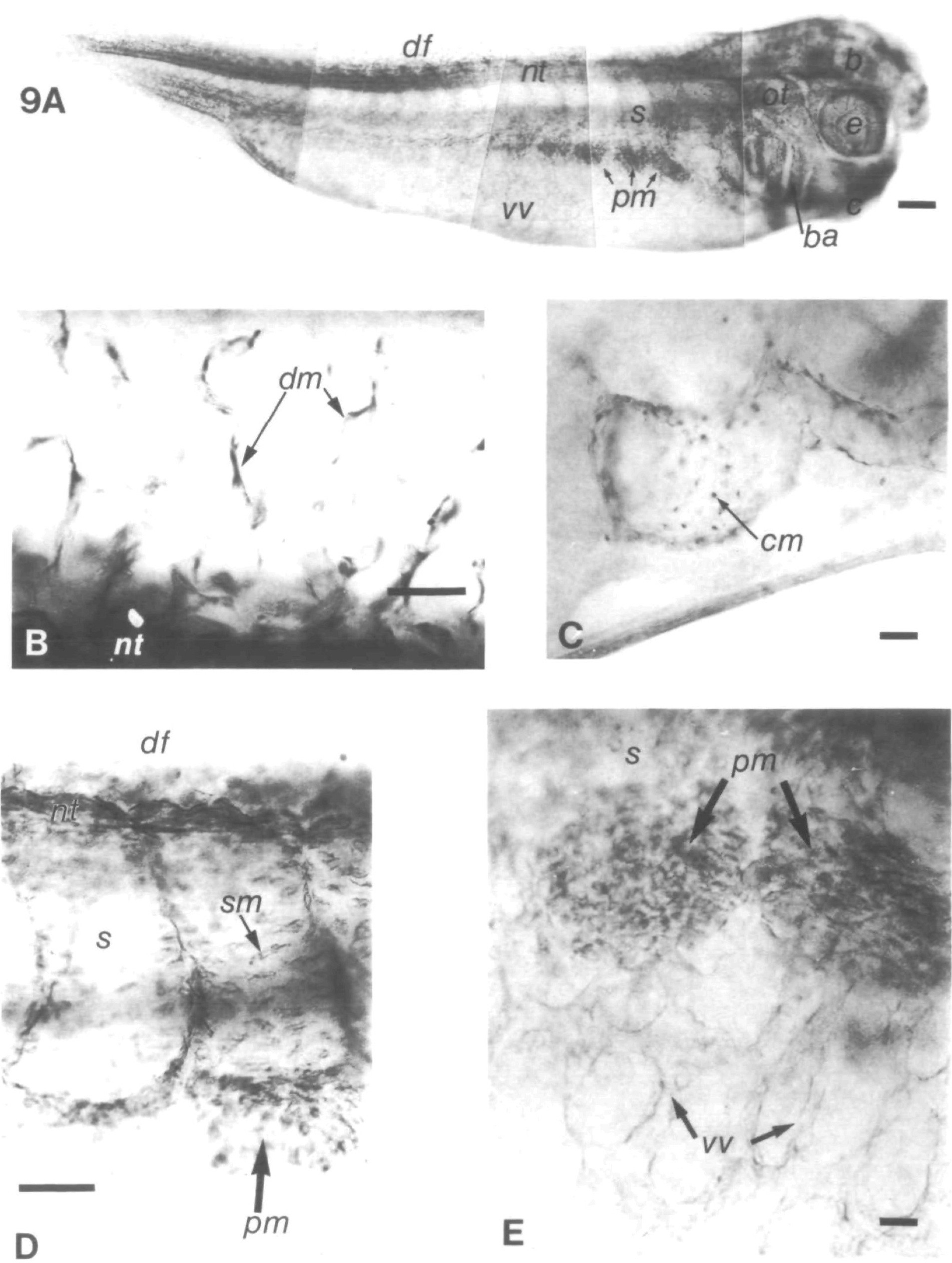 Fig. 9. Vimentin staining in the stage-35 embryo. In a lateral optic section of stage-35 embryo stained with RV202 (A), vimentin can be found in the neural tube, in the dorsal fin (df) and on the somites (the somitic mesenchyme is mostly out of focus in this picture). Vimentin is expressed in the pronephric mesenchyme (pm) below the first six somites with progressively less mesenchyme below the more posteriorsomites. The reticulated pattern of the vitelline veins (vv) can be seen throughout the belly around the yolky endoderm. Vimentin-expressing mesenchyme is present on the branchial arches (ba), around the otic vesicle (oi), covering the eye (e) and on the surface of the brain (b). A close-up optical section of the dorsal fin (B) reveals that the morphology of individual dorsal fin mesenchymal cells (dm) can be distinguished by the vimentin staining. In a lateral optical section midway through the embryo (C), vimentin-expressing mesenchyme surrounds the heart in the pericardial cavity (cm). A close lateral optical section of the anteriorsomites (D) reveals individual, vimentin-expressing mesenchymal (sm) cells. Individual pronephric mesenchymal cells (pin) are visible below the somites. A close lateral view of the region ventral to the anteriorsomites is shown in D. (E) reveals that the pronephric mesenchyme (pm) expresses vimentin, as do cells of the vitelline veins (vv). b, brain; ba, branchial arch; c, cement gland; df, dorsal fin; e, eye; nt, neural tube; ot, otic vesicle; s, somite; vv, vitelline veins. Bars, 250um in A, 50um in B, 20um in C, 100um in D and 20um in E.