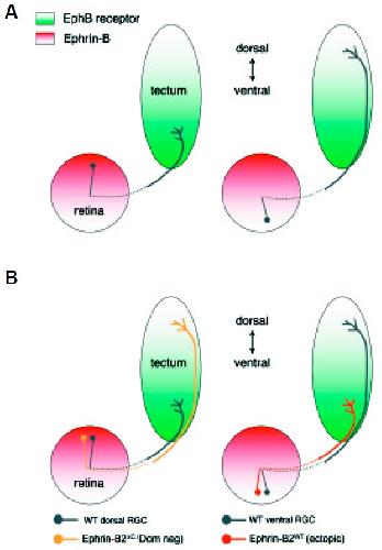 Topographic mapping in dorsoventral axis of the Xenopus retinotectal system depends on signaling through ephrin-B ligands.