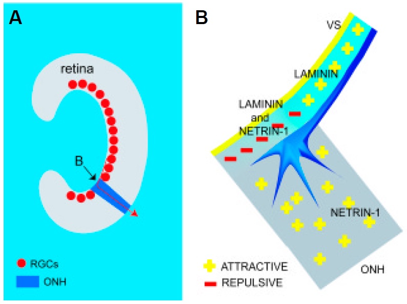 nerve head (ONH, dark blue; arrow at B) where netrin-1 is localized. (B)