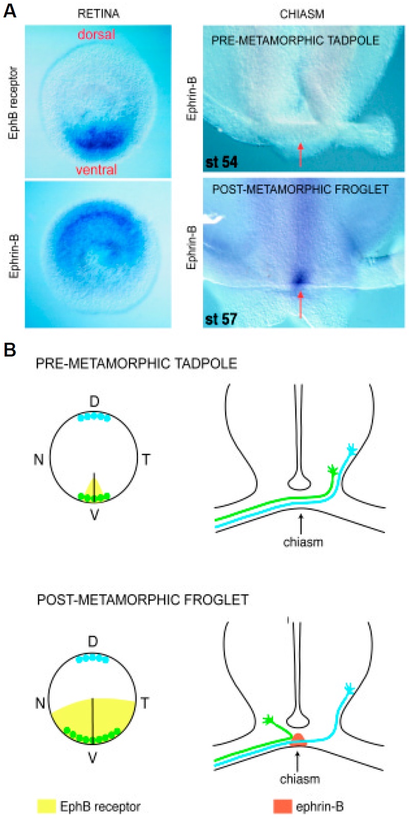 (left two panels) and the chiasm of pre- and post- and metamorphic Xenopus