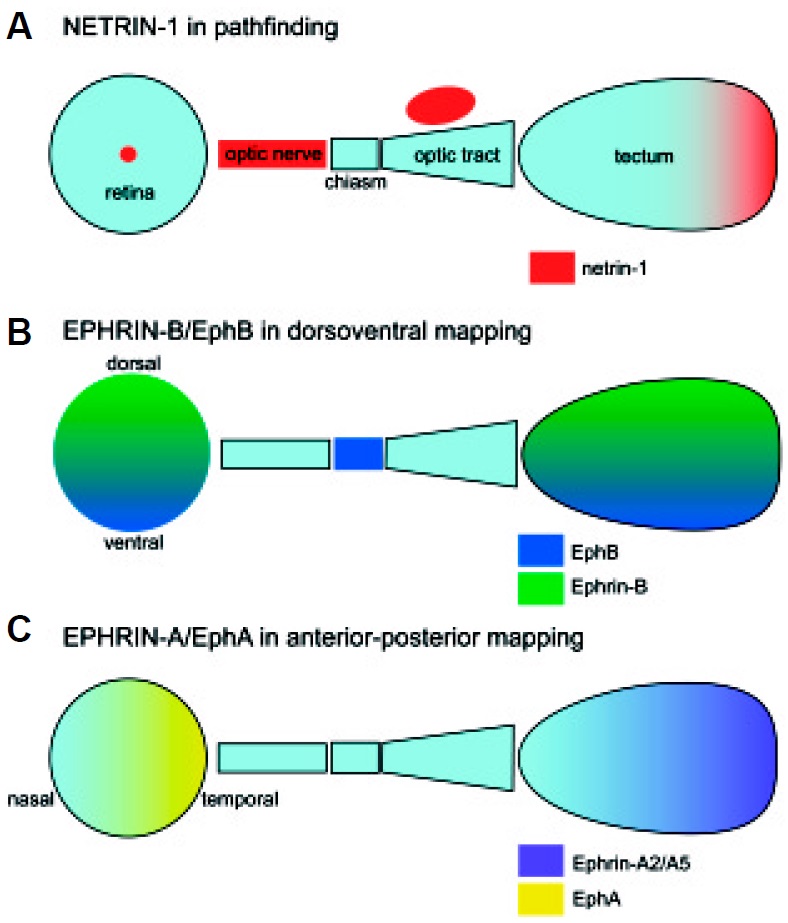 Fig. 1. Netrin-1 helps to guide the growth of axons out of the eye. (A)