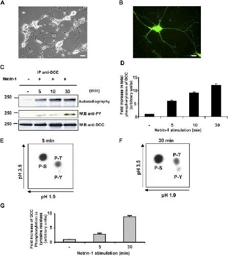 Figure 1. DCC is rapidly phosphorylated in vivo upon Netrin-1 stimulation in embryonic rat CN. (A) Phase-contrast image of E13 rat CN 72 h after plating on laminin. Bar, 40 μm. (B) Immunofluorescence of CN with anti-DCC antibodies showing DCC expression in the cell bodies and along the axons. Bar, 20 μm. (C) E13 rat CN labeled with [32P]orthophosphate for 2 h were either stimulated or not with Netrin-1 for 5, 10, and 30 min. Endogenous DCC was immunoprecipitated (IP) from the cell lysates. The radiolabeled proteins were subjected to SDS-PAGE and identified by autoradiography. The membrane was immunoblotted with anti-pY and anti-DCC antibodies to show the total amount of DCC. (D) Quantitative analysis of the phosphorylation level of DCC after Netrin-1 stimulation of rat CN. Fold increase in total phosphorylation of DCC was determined by densitometry (n = 3). Error bars represent SD. (E and F) The bands corresponding to phosphorylated DCC obtained after 5 min (E) or 30 min (F) of Netrin-1 stimulation were subjected to a phospho–amino acid analysis. (G) Quantitative analysis of DCC phosphorylation on tyrosine residues, using the method described in D (n = 3). Error bars represent SD. |
