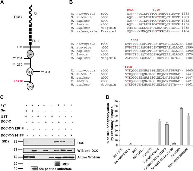 Figure 4. The intracellular domain of DCC is phosphorylated in vitro by Fyn tyrosine kinase. (A) The extracellular domain of DCC is characterized by four amino-terminal Ig-like domains and six fibronectin type III (FNIII) repeats, the transmembrane domain, and the cytodomain, which contains three regions according to the rat amino acid sequence: P1, P2, and P3. Protein mutants of rat DCC were created by substituting each tyrosine in the cytodomain at 1261, 1272, 1361, and 1418 positions into a phenylalanine residue. (B) Amino acid sequence alignment of DCC proteins from different species and human neogenin. The tyrosine residues corresponding to the rat amino acid sequence of DCC are shown in red. (C) 20 μg of GST fusion proteins containing the cytodomains of the wild-type DCC (DCC-C) and the DCC-C-Y1261F and DCC-C-Y1418F mutants was incubated without or with the active Fyn or Src kinases in the presence of γ-[32P]ATP. As positive controls, Fyn was incubated with 5 μg MBP, and Src with 5 μg of a specific peptide substrate. The products were analyzed by SDS-PAGE followed by autoradiography, and the total amount of GST fusion proteins was determined by Western blot (W.B) with anti-DCC antibodies. Autophosphorylated bands of Fyn and Src are also shown as positive controls of their autoactivation. (D) Quantitative analysis of the percent DCC phosphorylated by Src kinases in vitro. 100% corresponds to the phosphorylation of wild-type DCC-C protein (n = 3). Error bars represent SD. |