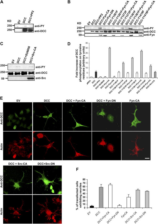 Figure 5. Fyn tyrosine kinase regulates the phosphorylation of DCC and is critical for DCC-induced neurite outgrowth in N1E-115 cells. (A) N1E-115 cells were transfected with empty vector (EV) or pRK5-DCC (DCC). Cells expressing DCC were treated with PP2. DCC was immunoprecipitated from the lysates, and the total amount of DCC was determined using anti-DCC antibodies. Anti-pY antibodies were used to show the level of DCC phosphorylation on tyrosines. (B) The empty vector (EV), DCC, DCC-Y1261F, DCC-Y1272F, DCC-Y1361F, or DCC-Y1418F constructs were transfected either alone or together with Fyn-CA, in N1E-115 cells. Cells expressing DCC were treated with the Src kinase inhibitor PP2. DCC was also cotransfected with Fyn-DN. The expression of these proteins was analyzed by Western blot using anti-DCC and anti-Fyn antibodies, and the phosphorylation levels of these proteins were assessed using anti-pY antibodies. (C) N1E-115 cells were transfected with empty vector (EV) or with DCC, alone or with Src-CA. DCC-transfected cells were also treated with SU6656. After DCC immunoprecipitation, the phosphorylation levels of these proteins were assessed using anti-pY antibodies, and the total amounts of the expressed proteins were determined using anti-DCC and anti-Src antibodies. (D) Quantitative analysis of the tyrosine phosphorylation of DCC and DCC mutant proteins in N1E-115 cells (n = 3). Error bars represent SD. (E) N1E-115 cells were transfected with empty vector (EV), Fyn-CA alone, and DCC either alone or together with Fyn-CA, Fyn-DN, Src-CA, or Src-DN. The cells were costained with anti-DCC antibodies and rhodamine-conjugated phalloidin to visualize the actin filaments. Fyn or Src expression was visualized using anti-p62 antibodies (Santa Cruz Biotechnology, Inc.) (not depicted). Bar, 20 μm. (F) Quantitative analysis of the percent of transfected N1E-115 cells exhibiting neurites shown in E (n = 3) was performed in a blinded fashion. Error bars represent SD. |