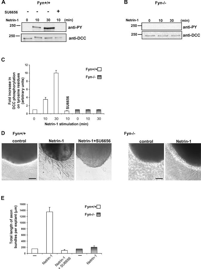 Netrin-1 acts as a chemoattractant molecule to guide commissural neurons (CN) toward the floor plate by interacting with the receptor deleted in colorectal cancer (DCC). The molecular mechanisms underlying Netrin-1-DCC signaling are still poorly characterized. Here, we show that DCC is phosphorylated in vivo on tyrosine residues in response to Netrin-1 stimulation of CN and that the Src family kinase inhibitors PP2 and SU6656 block both Netrin-1-dependent phosphorylation of DCC and axon outgrowth. PP2 also blocks the reorientation of Xenopus laevis retinal ganglion cells that occurs in response to Netrin-1, which suggests an essential role of the Src kinases in Netrin-1-dependent orientation. Fyn, but not Src, is able to phosphorylate the intracellular domain of DCC in vitro, and we demonstrate that Y1418 is crucial for DCC axon outgrowth function. Both DCC phosphorylation and Netrin-1-induced axon outgrowth are impaired in Fyn(-/-) CN and spinal cord explants. We propose that DCC is regulated by tyrosine phosphorylation and that Fyn is essential for the response of axons to Netrin-1.