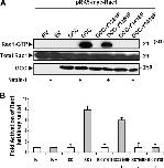 Figure 8. DCC phosphorylation on tyrosine 1418 is critical for Netrin-1âinduced Rac1 activation. (A) COS-7 cells coexpressing DCC, Y1261F-, or Y1418F-DCC mutants together with Myc-Rac1 protein were or were not treated with Netrin-1 for 5 min. The GTP-loaded Rac1 were pulled down from the cell lysates using GST-Cdc42/Rac interactive binding domain-Pak1 fusion protein. The proteins from the pull-down and from the total cell lysate were analyzed by Western blot using anti-DCC antibodies and anti-Myc antibodies to detect both Rac1-GTP and the total Rac1. (B) Quantitative analysis of Rac1 activation by DCC and DCC tyrosine mutants after Netrin-1 treatment (n = 5). Error bars represent SD. |