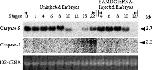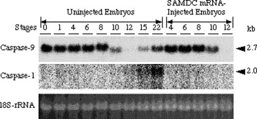 Northern blot analysis of caspase mRNAs in Xenopus embryos. Fertilized eggs were injected with SAMDC mRNA (100 pg/egg) or distilled water (uninjected, control embryos) and cultured in 1× Steinberg’s solution throughout the experiment to protect embryos from osmotic shock. RNAs were isolated from embryos, separated on a formaldehyde-containing 1% agarose gel, transferred to a nylon membrane filter, and hybridized with 32P-labelled probes specific for Xenopus caspase-9 or caspase-1. 18S rRNAs were stained with ethidium bromide. The amount of 18S rRNA is practically the same between uninjected and SAMDC mRNA-injected embryos even at stage 12, suggesting the maintenance of undegraded ribosomes in the apoptotic cells kept unruptured until this stage. Note that experiments were not performed in SAMDC mRNA-injected embryos after stage 12 because of the complete embryo death.