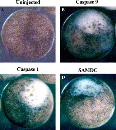 Induction of apoptosis by injection of mRNA for Xenopus caspase-9 or -1 in Xenopus embryos. Fertilized eggs of the same batch were injected with 100 pg/egg mRNA for caspse-9 (B), caspase-1 (C), or SAMDC (D), and cultured in 1Ã Steinbergâs solution to protect dissociated cells from rupture due to osmotic shock. White cells without pigmented surface coat are those dissociated due to execution of apoptosis, and these cells appeared first at the area of eggs where mRNAs were injected. Uninjected embryos were those injected with distilled water alone (A). Embryos were filmed at the early gastrula stage.