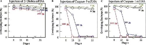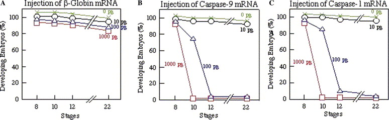 Time-course of the execution of apoptosis in Xenopus embryos injected with mRNAs for Xenopus caspases. Fertilized eggs were injected with 1000, 100, 10, or 0 pg/egg of mRNA for β-globin (A), caspase-9 (B), or caspase-1 (C), and cultured in 1× Steinberg’s solution throughout the experiment. Fifty embryos of the same batch were used for each experimental group.