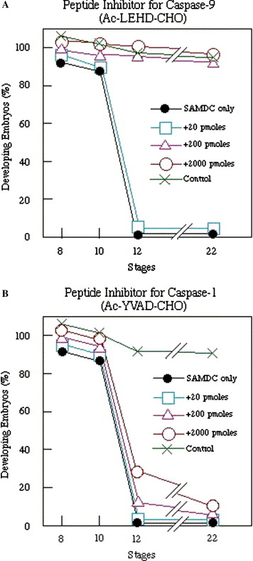 Inhibition of execution of post-MBT embryonic apoptosis in SAMDC mRNA-injected Xenopus embryos by peptide inhibitors for caspases. 2000, 200, 20, or 0 pmol/egg of the synthetic peptide inhibitor for caspase-9 (Ac-LEHD-CHO) (A) or caspase-1 (Ac-YVAD-CHO) (B) was co-injected with 100 pg/egg SAMDC mRNA into Xenopus lavies fertilized eggs. Control embryos were injected with distilled water alone. Fifty fertilized eggs from the same batch were used for each experimental group. Percentage of developing embryos was plotted against the ordinate according to the developmental stages. Three independent experiments were done, with essentially the same results.