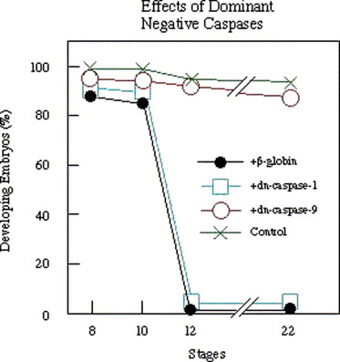 Effects of the injection of the mRNA for âdominant negative typeâ caspases. One hundred picograms per egg of mRNAs for dn-caspase-9, dn-caspase-1 or β-globin was injected together with 100 pg/egg mRNA for SAMDC into each of the two blastomeres of 2-cell stage Xenopus embryos. Control embryos were injected with distilled water alone.