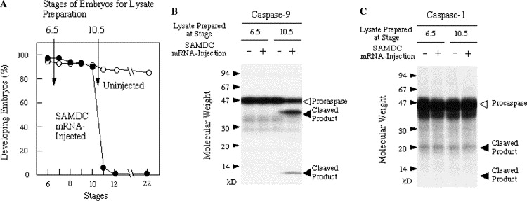 Induction of procaspase-9-cleaving activity in SAMDC mRNA-injected Xenopus embryos. (A) Embryos were injected with 100 pg/egg mRNA for SAMDC (closed circles) or β-globin (open circles) into both of the blastomeres of the two cell stage embryo (200 pg/embryo) and cultured in 1à MBS to protect osmotic embryo lysis throughout the experiment. Fifty embryos were collected and lysed in the homogenizing buffer (cf. Materials and methods) either at stage 6.5 or stage 10.5 to prepare cell-lysates. (B,C) 35S-labelled procaspase-9 (B) and procaspase-1 (C) were incubated with the cell lysates prepared at stage 6.5 or 10.5 (A) from embryos which had been injected with mRNA for SAMDC (+) or β-globin (â). Reaction mixtures were subjected to gel electrophoresis under reducing conditions. Independent experiments were three times repeated, with essentially the same results.