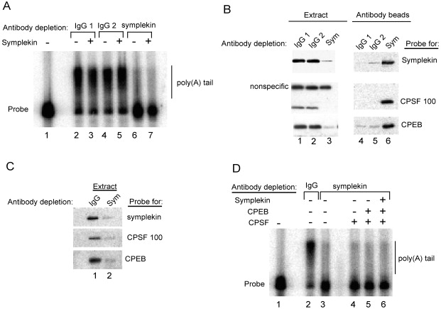 (C) Extracts depleted with symplekin antibody or control IgG were probed for symplekin, CPSF100, and CPEB.
