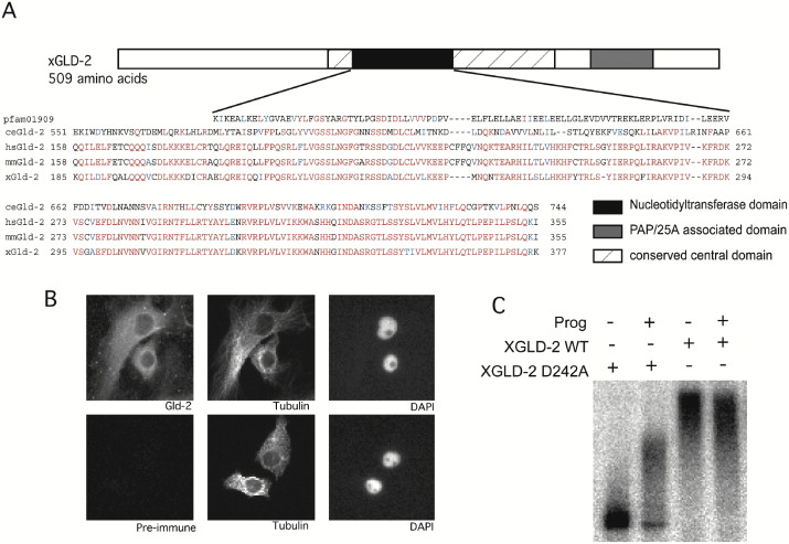 Figure 4 Identification of a Novel Xenopus Cytoplasmic Poly(A) Polymerase. (A) Representation of the 509 amino acid Xenopus GLD-2 (xGLD-2) protein, indicating the catalytic domain with a flanking conserved central domain region as well as the PAP/25A (polyA) polymerase) conserved domain and the nucleotidyltransferase domain. An alignment generated from ClustalW analysis of related GLD-2 sequences from several animals shows the conserved nucleotidyltransferase domain from C. elegans (ceGLD-2), human (hsGLD-2), mouse (mmGLD-2), and Xenopus (xGLD-2).