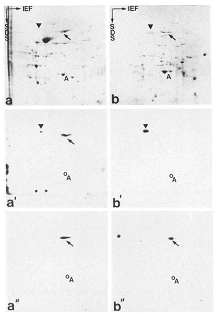 nearly isoelectric with actin (a" and b"; arrow), as expected from
