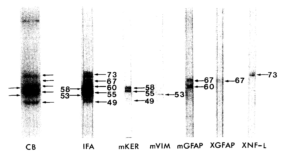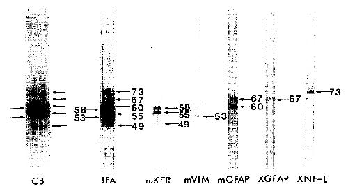 adult central nervous system and were immunoreactive with a 67 kDa GFAP-Iike protein, and a low mol. wr. (73 kDa] neurofilament