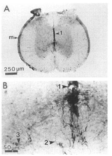 central canal and central ependymal septa (arrowhead at 1). B: