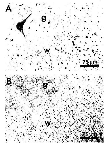 cell bodies and processes in the grey matter (g) and with axons