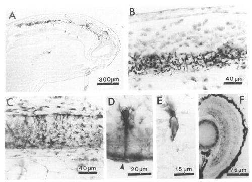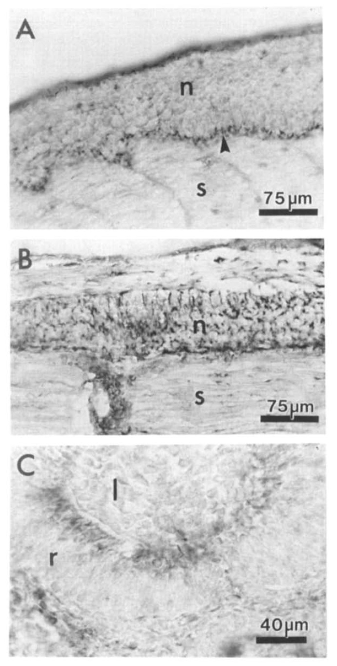layer (C). (The retinal pigmented epithelium is seen on the left, and the retinal ganglion cell layer is to the right.) In contrast to the retina,
