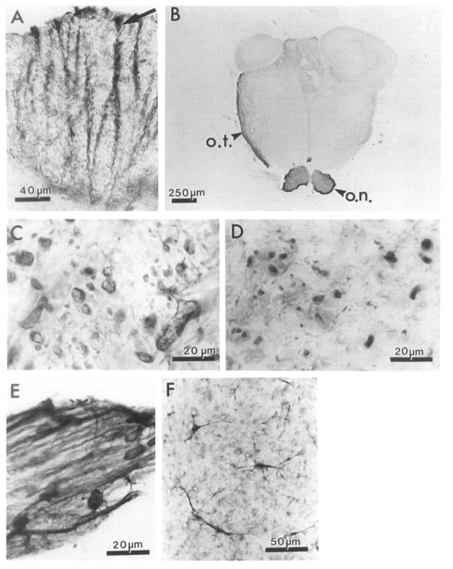identical. B: a view of immunoreactive processes in the optic tract (o.t.) and optic nerve (o.n.) in a frozen section cut from the brain of