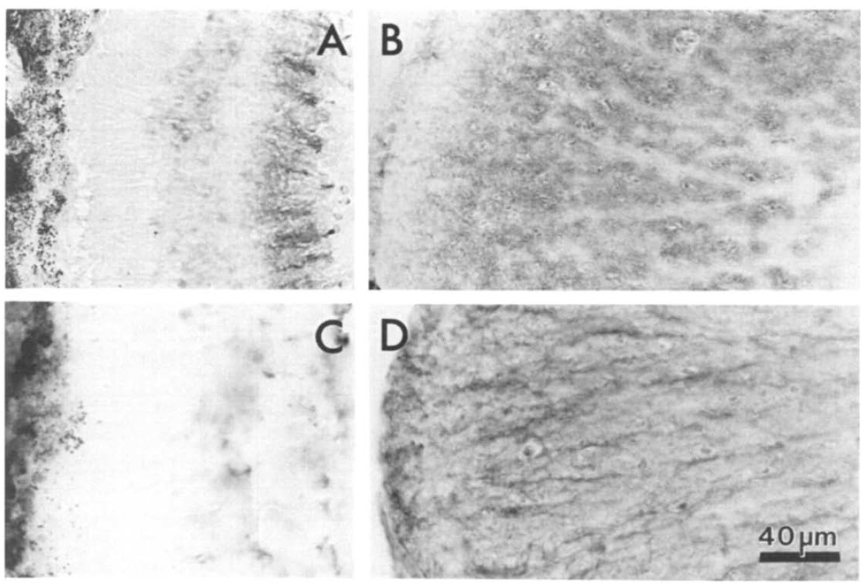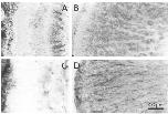Fig. 5. Comparison of GFAP-Iike (A,B) and vimentin-like (C,D) immunoreactivities in frozen sections from the retina (A,C) and lateral