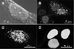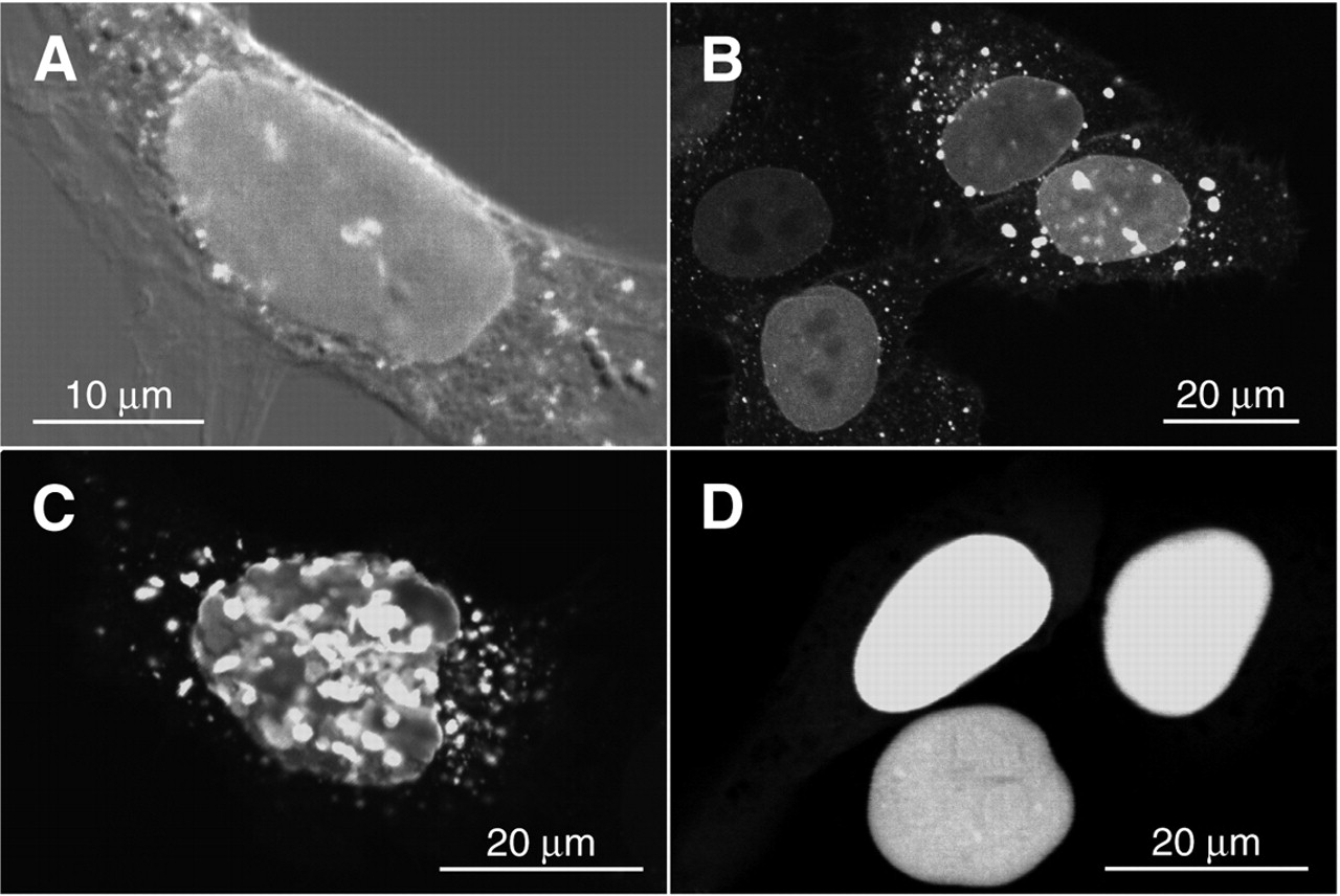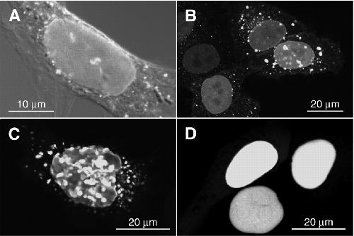 Fig.4. Nuclear GFP containing the membrane targeting motifs of N-Ras induces intranuclear vesicular structures. HeLa cells transiently transfected with NLS-MT-GFP-N-Ras (A-C) or NLS-MT-GFP (D) chimeras were fixed 24 hours after transfection and examined by fluorescence confocal laser scanning microscopy. In A an overlay of the GFP fluorescence and differential interference contrast picture is shown. Note the presence of brightly fluorescing vesicular structures inside nuclei of cells expressing high levels of the chimeric GFP in C. Bar, 10 μm (A); 20 μm (B-D).
