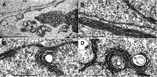 Fig.5. NLS-MT-GFP-N-Ras chimeras induce formation of intranuclear membrane arrays in HeLa cells. (A-D) HeLa cells transiently transfected with NLS-MT-GFP-N-Ras were processed for EM 24 hours after transfection. Sections were stained with uranyl acetate and lead citrate. Note the formation of stacked membrane cisternae aligned with the nuclear envelope as well as the formation of membrane arrays within the nucleoplasm. NE, nuclear envelope; PM, plasma membranes. Bar, 5 μm (A); 1 μm (B-D).