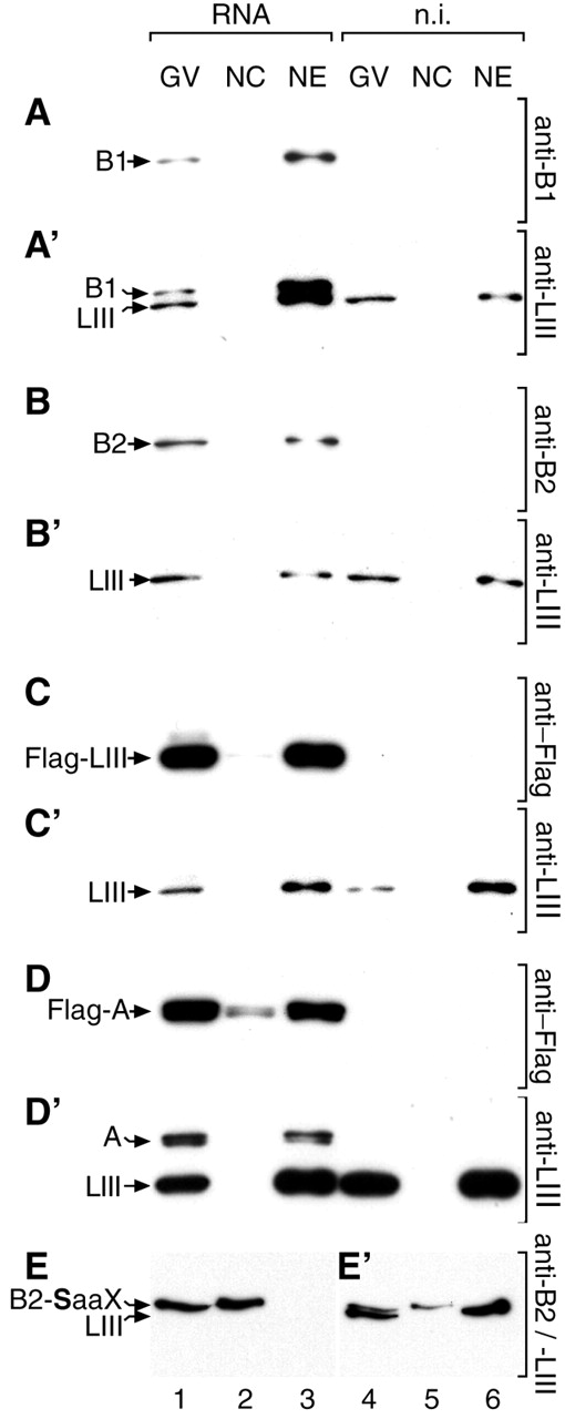 Fig.1. Lamins synthesized in oocytes associate with the nuclear envelope. (A-E') Lamins were expressed in Xenopus oocytes by RNA injection. 16 hours after injection nuclei were manually isolated and either processed directly (GV, lane 1) or separated into nuclear content (NC, lane 2) and nuclear envelope (NE, lane 3). Fractions were separated by SDS-PAGE and lamins were detected by immunoblotting using chemiluminescence. Material from three nuclei was loaded in each lane. Lamin B1 was detected with mAb L7-4A2 (A), lamin B2 with mAb L7-8C6 (B,E), lamin Flag-LIII and Flag-A with mAb M2 (C and D, respectively). Control fractions of uninjected oocytes (n.i.) were processed in parallel (lanes 4-6). All blots were reprobed with lamin LIII-specific mAbs, mAb L6-5D5 (A'-D') or mAb NUC195 (E'). Note that blots were not stripped before reprobing, therefore, residual chemiluminescence signal from the first immunoreaction was still detectable, as seen in A'-E'.