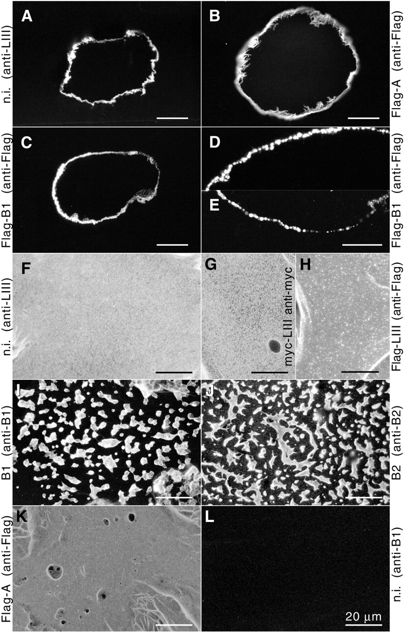 Fig.2. Indirect immunofluorescence analysis of oocytes synthesizing nuclear lamins. Cryostat sections (A-E) and nuclear envelope spread preparations (F-L) are shown. The type of RNA injected is indicated at the margins of each panel. n.i., non-injected control oocytes. Oocyte lamin LIII was detected with mAb NUC195 (A) or mAb L6-5D5 (F), Flag-A, Flag-B1 and Flag-LIII with mAb M2 (B-E,H,K), lamin B1 and non-injected control envelopes were reacted with mAb L7-4A2 (I,L); myc-LIII with mAb 9E10 (G); lamin B2 with mAb L7-8C6 (J). Cy3-conjugated goat anti-mouse IgG was used as a secondary antibody. Brighter staining along folds of the nuclear envelope in F-H, K is due to folding of the nuclear envelope during the spreading procedure. Bars, 20 μm.