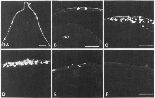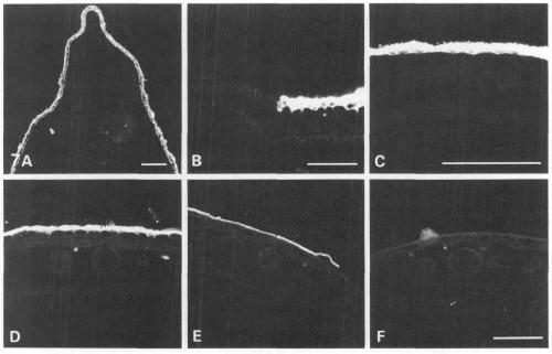 were stained as described in Fig. 2. C-F were dorsal epidermal sections. (A) Stage 40; (B) stage 46; (C) stage 58;