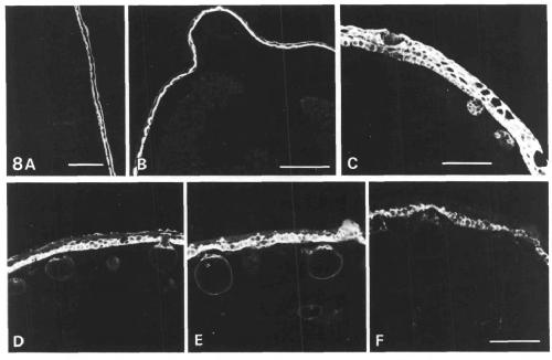 polyester wax sections (A-E) were stained with XEPI-5 and FFTC-conjugated rabbit antimouse IgG. (A) Stage 8;