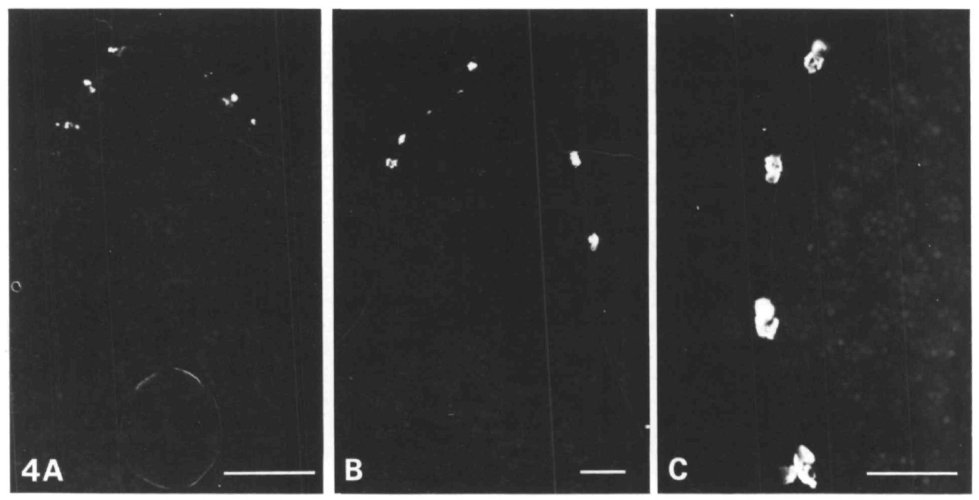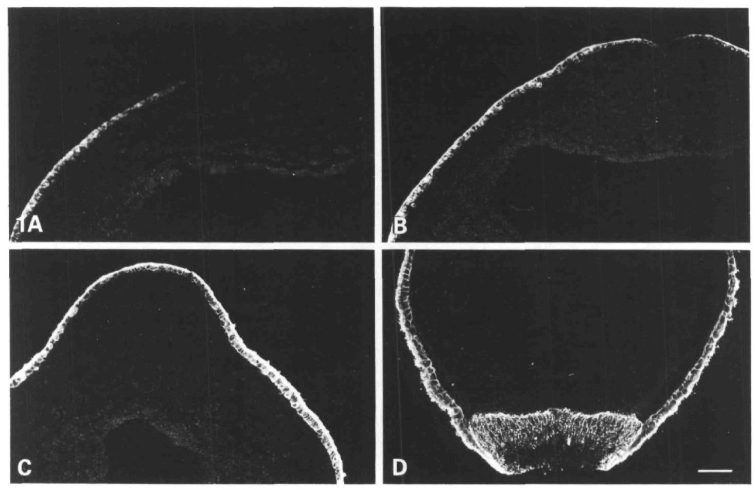 were stained with XEPI-4 and FITC-conjugated rabbit antimouse IgG. (A) Stage 28; (B,C) stage 36. Bar, 100um