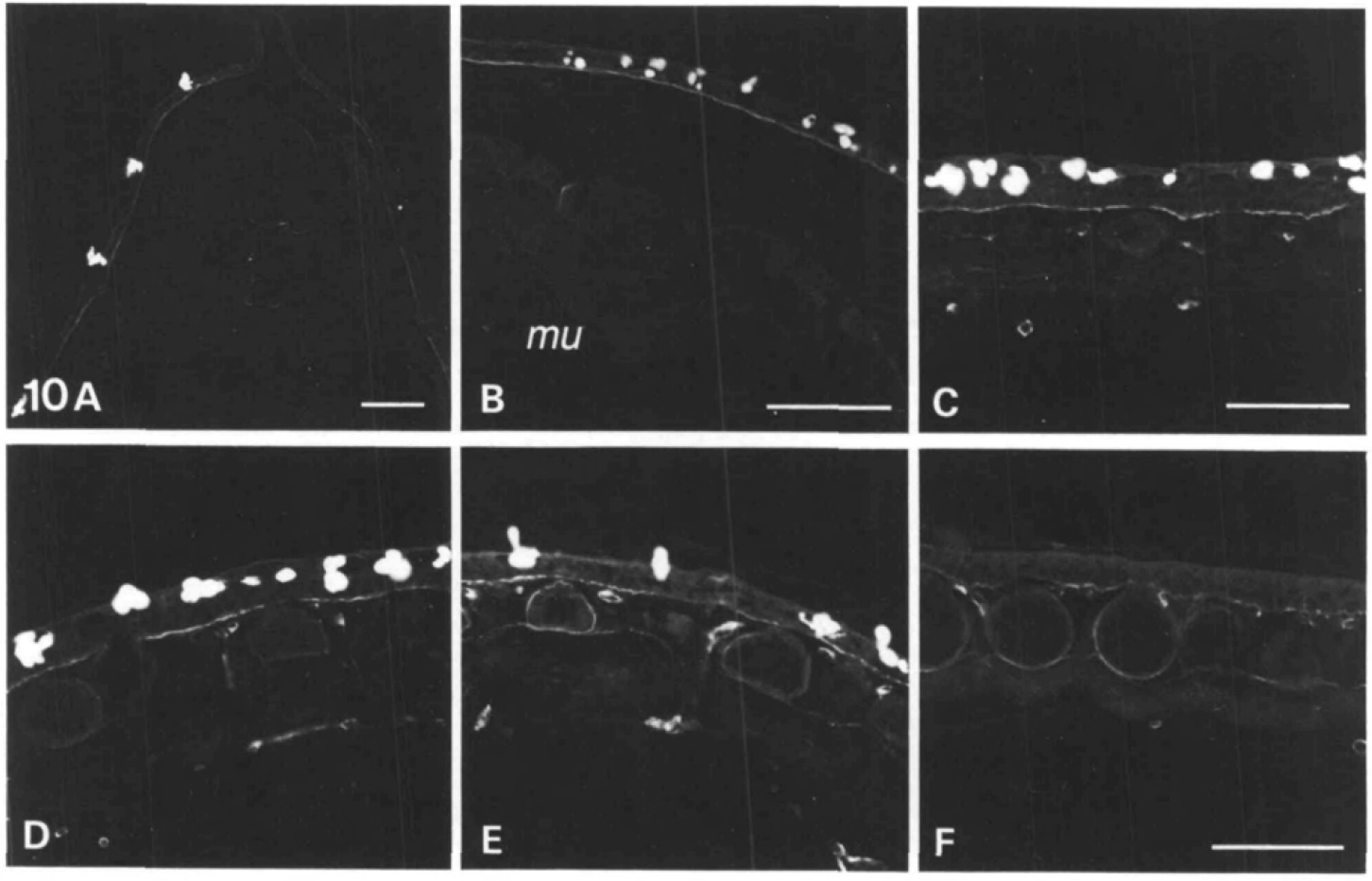 stained as described in Fig. 1. B-F were dorsal epidermal sections. (A) Stage 40; (B) stage 54; (C) stage 58; (D) stage